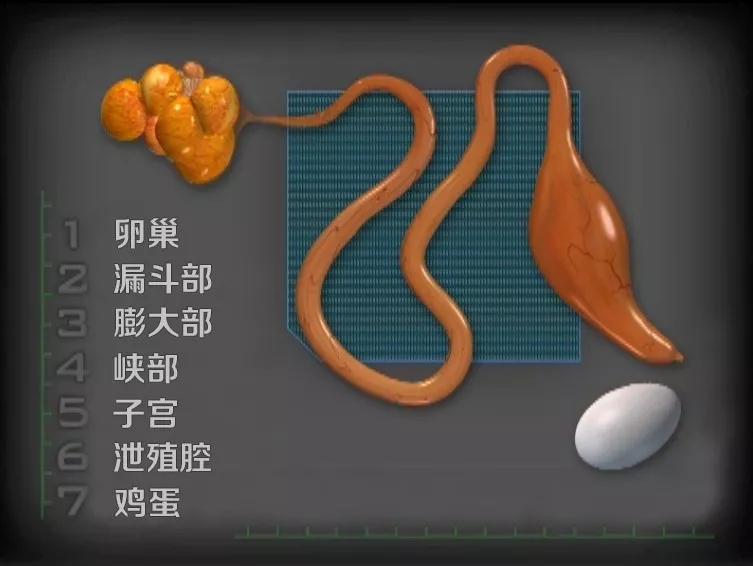 蛋雞的生殖系統(tǒng)稱為輸卵管,包括卵巢、漏斗部、膨大部、峽部、子宮、泄殖腔。大多物種的雌性動(dòng)物具有左右兩條輸卵管,但鳥(niǎo)類只發(fā)育了左邊那條,長(zhǎng)約2英尺(60厘米)。