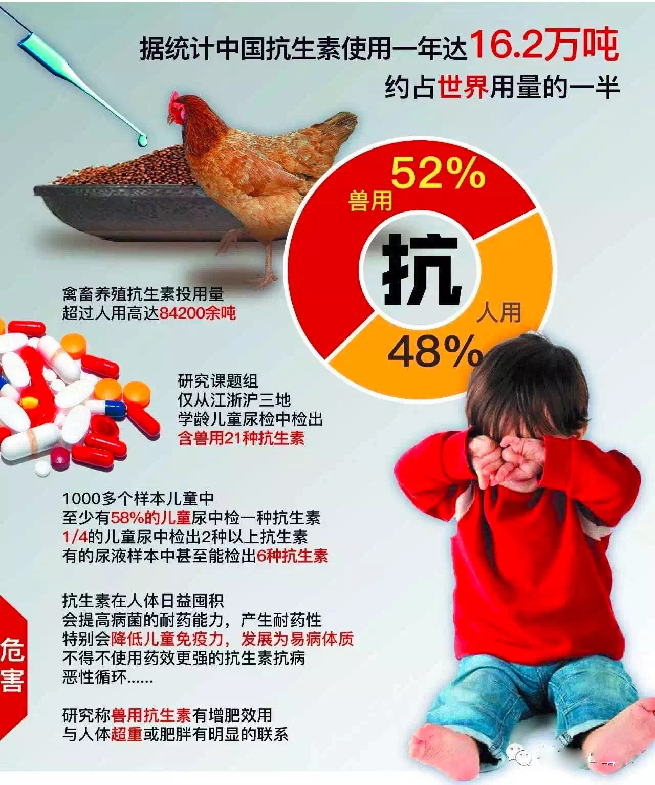 動(dòng)物飼料添加抗生素能幫助動(dòng)物預(yù)防疾病、促進(jìn)生長(zhǎng),提高產(chǎn)量。但抗生素用多了,動(dòng)物耐藥性增強(qiáng),會(huì)出現(xiàn)一些副作用。長(zhǎng)期食用“有抗食品”,消費(fèi)者的耐藥性也會(huì)不知不覺(jué)增強(qiáng),等于在人體內(nèi)埋下一顆“隱形炸彈”。