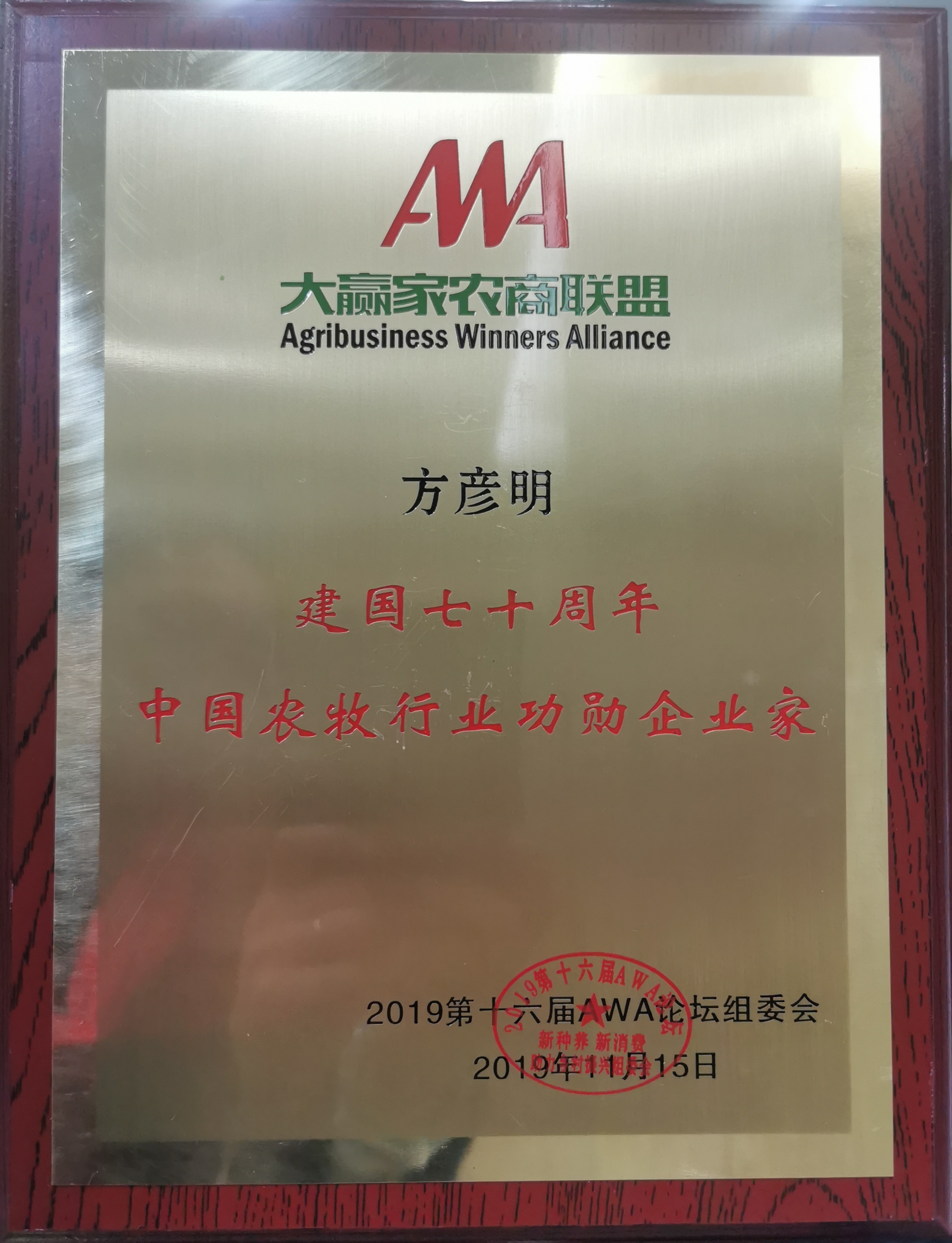 和農(nóng)牧業(yè)集團(tuán)董事長(zhǎng)方彥明先生榮獲建國(guó)70周年中國(guó)農(nóng)牧行業(yè)功勛企業(yè)家