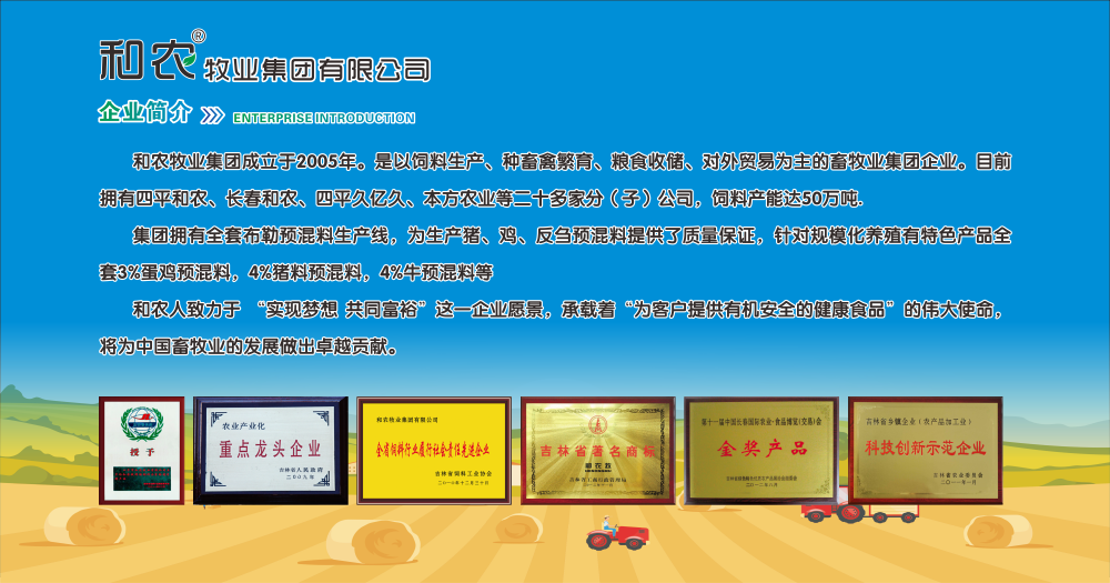 和農(nóng)牧業(yè)集團(tuán)成立于2005年,是以飼料生產(chǎn)、種畜禽繁育、糧食收儲(chǔ)、對(duì)外貿(mào)易為主的畜牧業(yè)集團(tuán)企業(yè)。飼料產(chǎn)能達(dá)50萬噸,集團(tuán)擁有全套布勒預(yù)混料生產(chǎn)線,為生產(chǎn)豬、雞、反芻預(yù)混料提供了質(zhì)量保證,針對(duì)規(guī)模化養(yǎng)殖有特色產(chǎn)品全套3%蛋雞預(yù)混料,4%豬料預(yù)混料,4%牛預(yù)混料等。